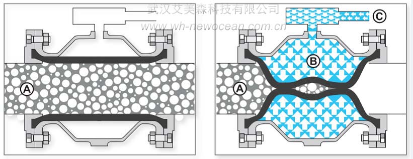 在控制介质未输入时,气动管夹阀胶套和阀体之间的空腔与大气连通,胶套受流体压力处于向外张紧状态。因为气动管夹阀管套内有一定角度排列的增强帘布层,使管套轴向和径向压力相互平衡,所以气动管夹阀管套的长度与直径不会因为流体压力而变化。当控制介质进入气动管夹阀管套与阀体之间的空腔时,管套在控制介质压力下变形截流。