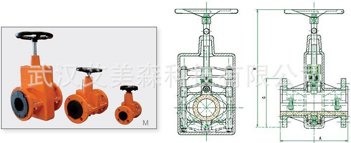 2)工作原理:当顺转手轮时,管夹阀大小阀杆同时带动上下闸板,压缩管夹阀胶套,管夹阀关闭,反转即行开启。这样,闸板在左右导柱之间上下往复完成阀门开闭工作。